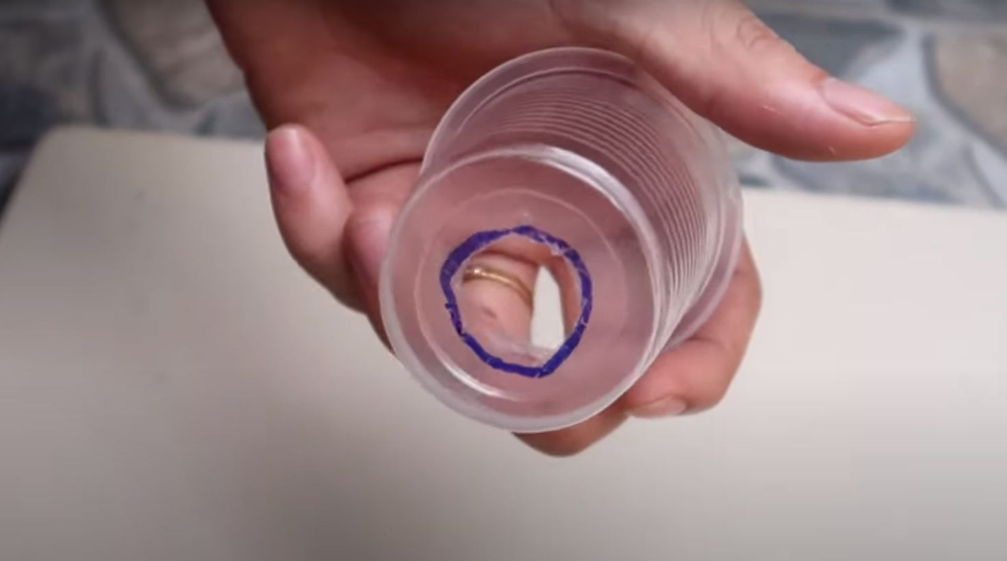 Następnie, narysuj kółka na dnie plastikowych kubków i również je wytnij.
