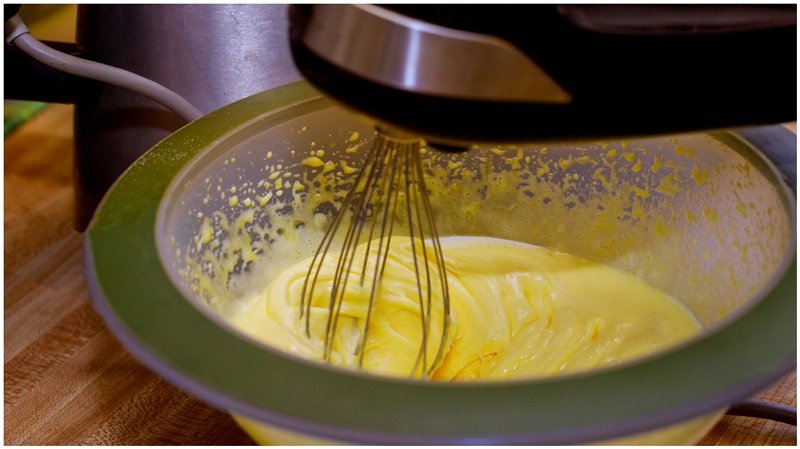 Do rondelka ubić jajka, dodać cukier i cukier waniliowy. Wymieszaj mikserem. Dodaj tam kawałek masła i śmietany. Wszystko wymieszaj trzepaczką. Dodaj mąkę kukurydzianą, wymieszaj i zagotuj.