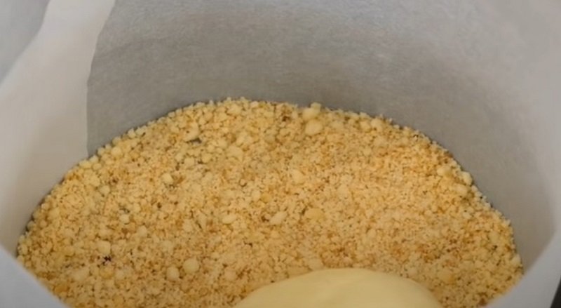Tortownicę (o średnicy ok. 20 cm) wyłożyć papierem do pieczenia. Ciasto podzielić na 4 części, a następnie oddzielić kolejną część do posypania. Wlej trochę okruchów na dno naczynia do pieczenia. Powinna wyjść cienka, równomierna warstwa.