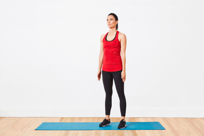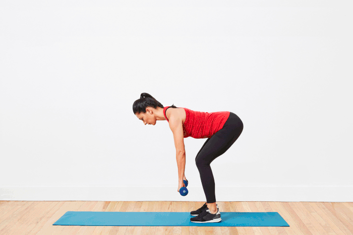 Twój postój? Pewny. Hantle? Przy biodrach. Stopy? Na wysokości bioder. Chcąc upuścić hantle na stopy, przechyl się do przodu, ręce przed siebie. Unosząc pupę do góry, pamiętaj o delikatnym uginięciu kolan. Twój cel – ciało równoległe do podłogi. Zawsze pamiętaj: hantle blisko ciała, kręgosłup neutralny.