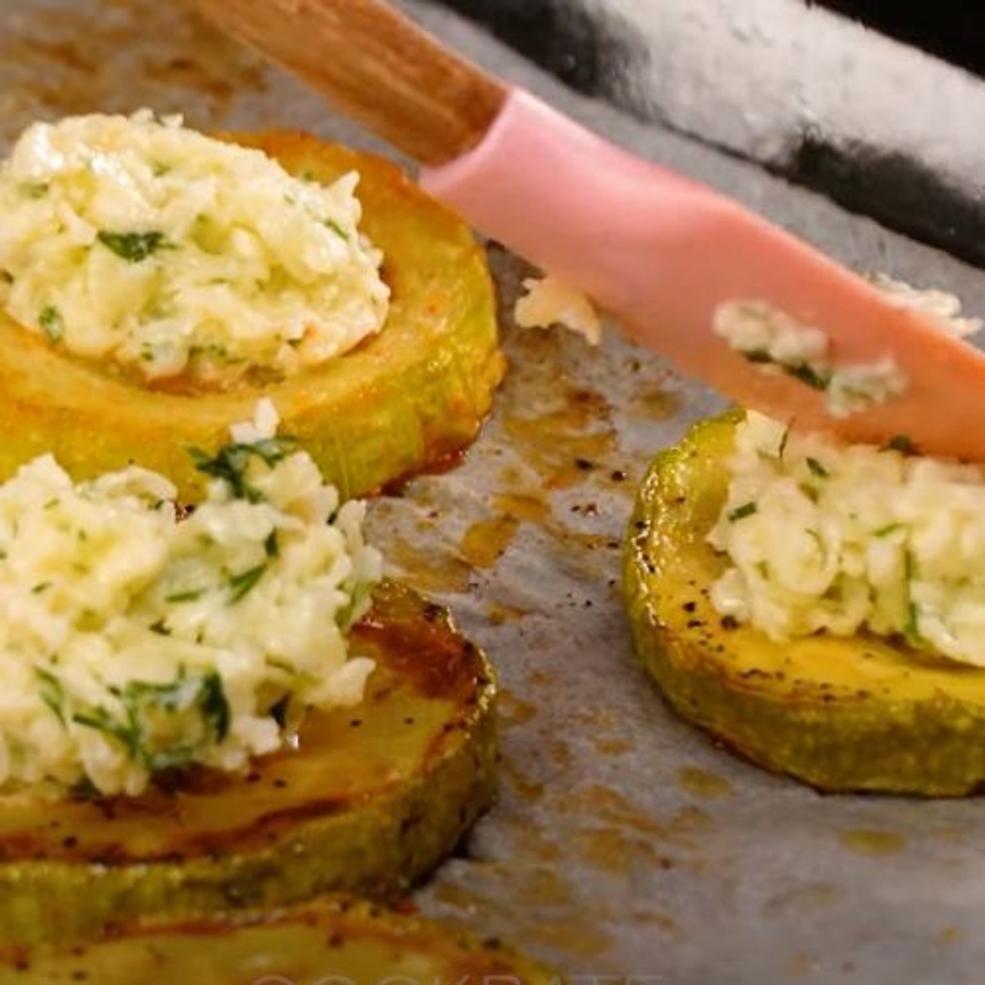 4. Nadziewanie cukinii: Na podpieczonych plastrach cukinii ułóż farsz. Ponownie umieść blachę w piekarniku i piecz przez kolejne 10 minut.
