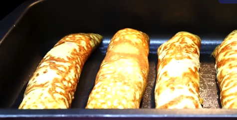 Tak przygotowane naleśniki ułóż na blaszce (wysmarowanej olejem). Czas pieczenia wynosi 30 minut.