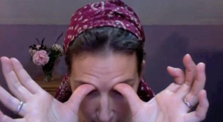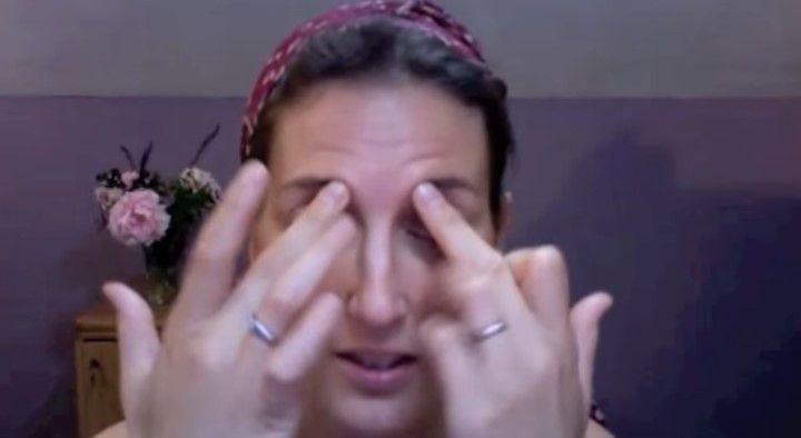 Nasze palce znajdują się teraz w początkowym punkcie każdej brwi. Pochylamy następnie głowę do przodu i opieramy ją na dłoniach, a nasze łokcie zostawiamy wsparte na biurku, stole itp.