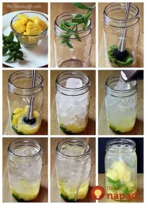 Umytą miętę włóż do pojemnika i rozgnieć. Następnie dodać owoce i ponownie zmiksować. Dodaj lód i wodę. Wymieszaj lemoniadę.