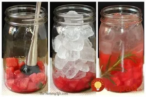Kawałki arbuza wraz z rozmarynem włóż do pojemnika i rozgnieć. Dodać lód, wymieszać i zalać wodą.