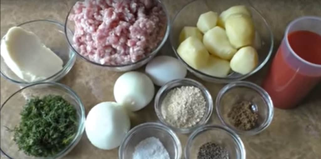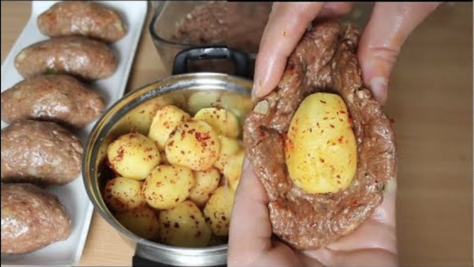 Wszystko miksujemy. Następnie z mięsa mielonego robimy małe naleśniki. Zapakujemy do nich ziemniaki. Pozostałe ziemniaki umieszczamy wśród ziemniaków mięsnych.