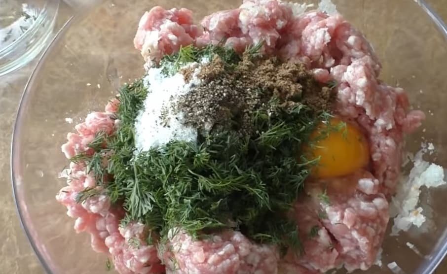 Cebulę kroimy na małe kawałki. Wymieszaj z bułką tartą, aby wchłonęły sok z cebuli. Następnie dodaj mięso mielone, jajko, koperek, sól, kolendrę i czarny pieprz.