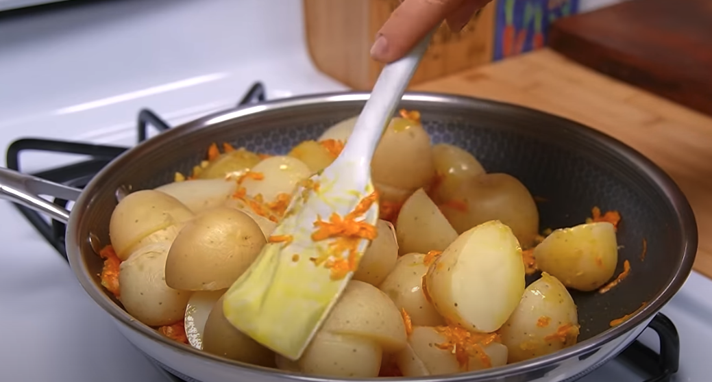 Dodaj cebulę i smaż, aż będzie miękka i lekko złota. Dodaj paprykę, czosnek i marchewkę. Smaż, aż warzywa będą miękkie. Odcedź ugotowane ziemniaki i przekrój je na połówki. Na patelni rozgrzej masło. Dodaj ziemniaki i smaż, aż będą złociste i chrupiące. Dodaj sól i czarny pieprz do smaku. Posyp ziemniaki pietruszką.