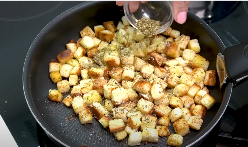 • Dodaj chleb, sól, suszony czosnek i włoskie zioła.
