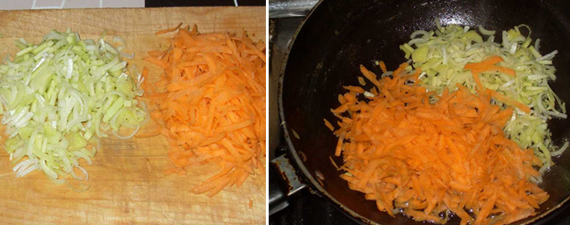 2. Tak przygotowane warzywa, wrzuć do garnka i lekko podsmaż na maśle. Gdy marchewka będzie miękka a cebulka zeszkli się, zalej wszystko bulionem.