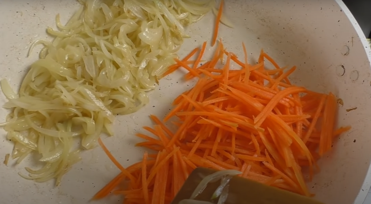 Obierz cebulę i pokrój ją w drobne paski. Następnie podsmaż je na patelni, tak by się zeszkliły. W międzyczasie posiekaj marchewkę i również podsmaż ją na patelni, lecz nie mieszaj z cebulą na tej samej patelni.