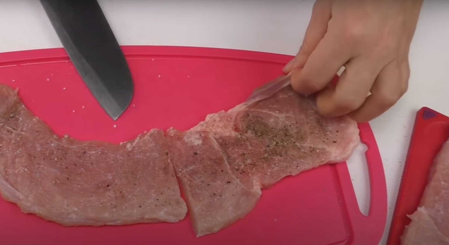 Steki wieprzowe rozbij na cienkie plastry. Warto wykorzystać folię spożywczą, aby podczas ubijania mięsa nie pobrudzić blatu dookoła. Rozbite steki posól i popierz. Możesz także posypać je ulubionymi ziołami.