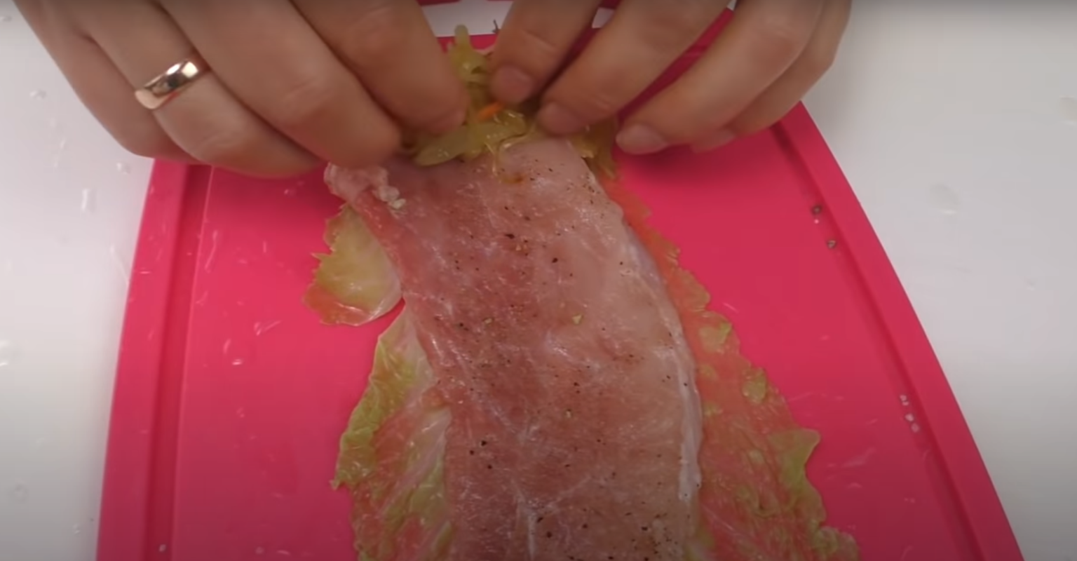 Liście kapusty pekińskiej włóż na 5 minut do gorącej wody. Następnie zawiń mięso w liście. Dodaj do środka także cebulę i marchewkę.
